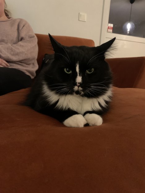 Stor hannkatt som hovedsakelig er sort, men hvite detaljer i ansiktet, på bryst/mage og hvite poter. Har en sort sirkel under munnen som er særegen for han.