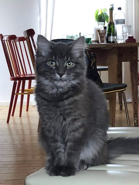 Sølvgrå, halvlang pels. Liten hvit kant rundt øynene. Antydning til striper. Fluffy hale som ofte står rett opp.