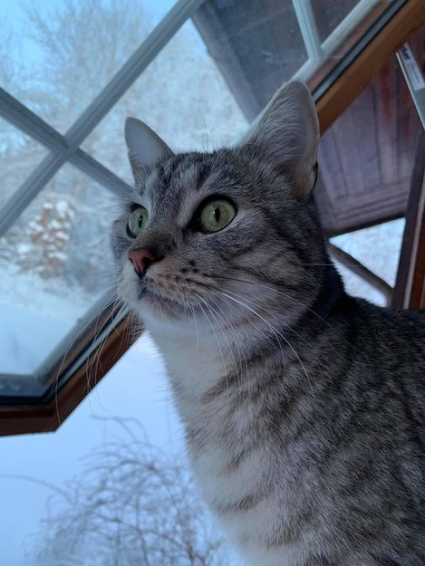Hvit og grå katt med mørke striper. Han er en relativt stor katt.