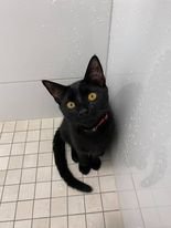 Han er et 2 år gamle kattung, han har på seg rød halsbånd.