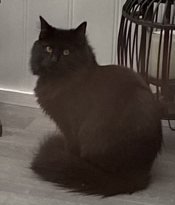 Gule øyne, pelsen kan se litt brun ut i sola, han er ikke av den som har den lengste pelsen, sånn midt i mellom kort og lang. Litt sky for mennesker redd for biler og høye lyder.