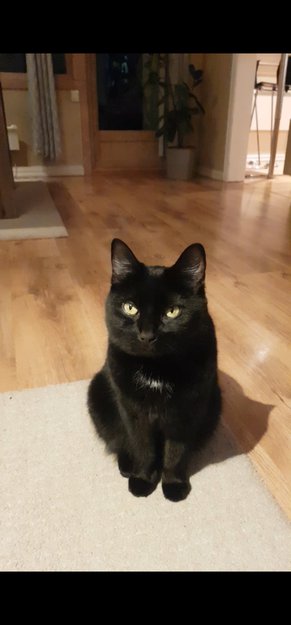 Svært med en liten flekk hvit på brystet. Veldig snill kat som er veldig forsiktig av seg.