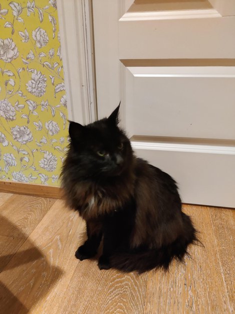 Pus har sort, lang pels med et lite hvitt parti på brystet. Han har i tillegg en knukket hjørnetann. Virker som han er kastrert, uten at vi er sikker. Han er ikke chippet.