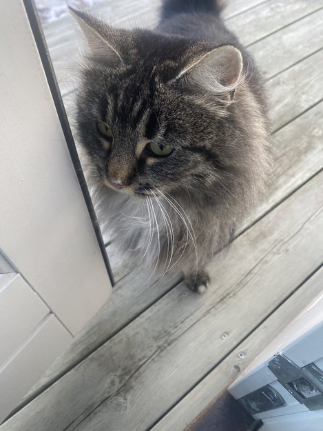 Katten har flyttet inn i Hagen vår. Veldig kosete og kontaktsøkende. Smetter inn i huset hver gang barna åpner døra. Håper eier kommer til retteå