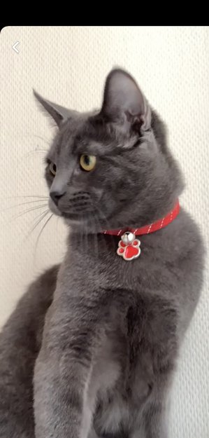 Han har på seg rød halsbånd med navnet hans og mobilnummeret mitt. Ricko har veldig glatt og skinnende pels.