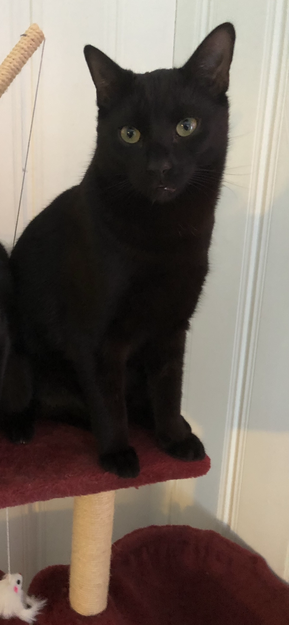 Svart med noen få hvite hårstrå på brystet. Ganske spisse ører og en lang hale.