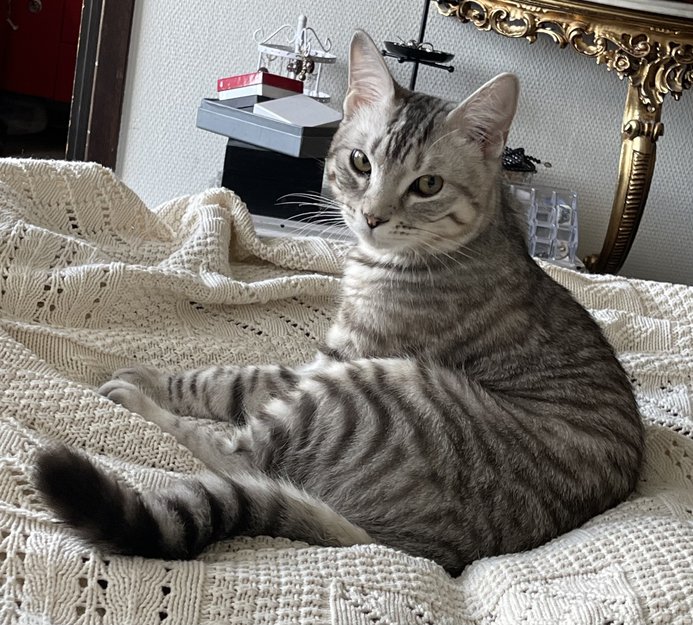 Vasilij er lysegrå med sorte striper og prikker. Grønne øyne. Korthåret. Han er ikke stor, bare 7 måneder gammel.