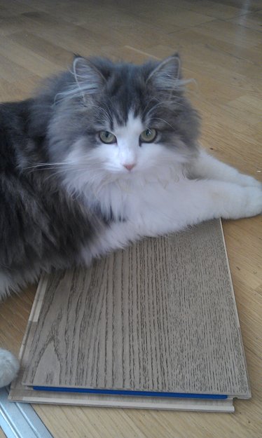 Grå og hvit langhåret katt borte på Bøler. Den har halsbånd og chip 578077000182813