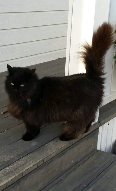 Svart, liten hunnkatt. Kan frese og knurre når hun er utrygg, men er verdens mest kosete pus når hun er trygg.