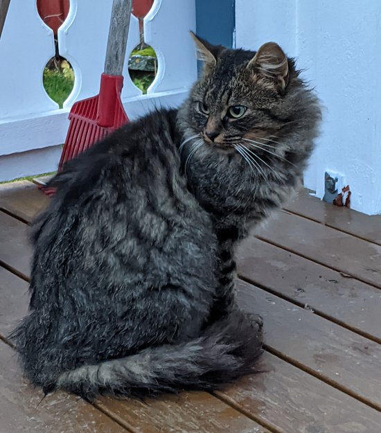 Ukastrert hannkatt, har vært titt og ofte innom hos oss og besøkt vår katt. Glad i oppmerksomhet, følger etter deg, liker kos og kan bli løftet. Likevel litt skeptisk på folk. Aldri sloss med vår katt, veldig trivelig type. Virker veldig sulten.