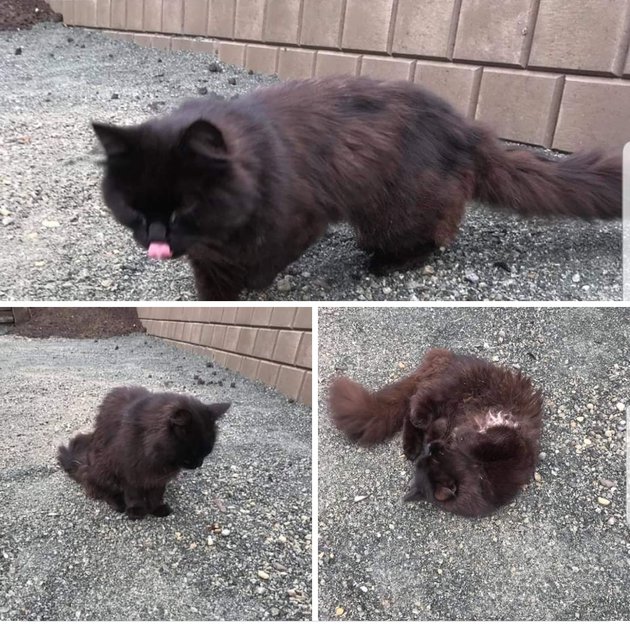 Han er svart med brunlig skjær. Stor og fluffy hale, mye pels rundt hodet men tynnere hårpartier på rygg og sider. Hadde et lite hvitt parti på brystet da han forsvant. Gule øyne. Kastrert og chippet. 2 år da han ble borte. Får lett hårballer i pelsen. Tillitsfull og kjælen.