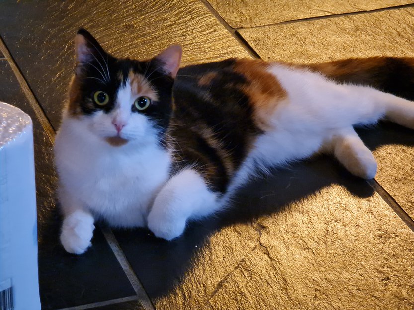 Mellomstor hunnkatt,tricolor svart,oransje og hvit!