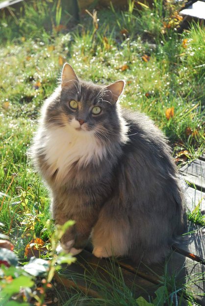 Kan se ut som maine coon katt. Har en "M" i panna.Blir fort klumpete i pelsen. Er hvit under haken og hvite poter. Veldig glad i folk og kos.