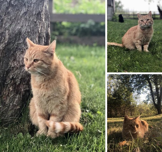 Oransje hannkatt. Kan være sky, men også kontaktsøkende. Kosete, skvetten.