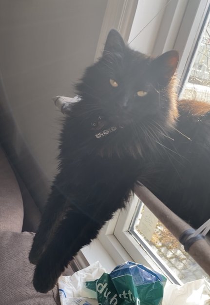 Helt brunsvart pels, langhåret og fluffy. Tynt hår over øynene opp mot ørene. Har på et svart halsbånd (med snap lock funksjon) med hvite hodeskaller og en bjelle. Beskjeden og skeptisk mot fremmede, og ikke høylytt av seg; inntil han finner ut at du kan kose.