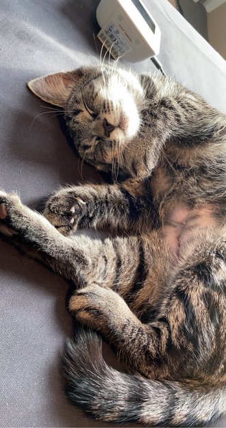 Stripet grå/beige/sort. Veldig kosete. Nylig kastrert, så kortere hår på magen/buken. ID tatovering i begge ørene. Maler veldig høyt ved kos.