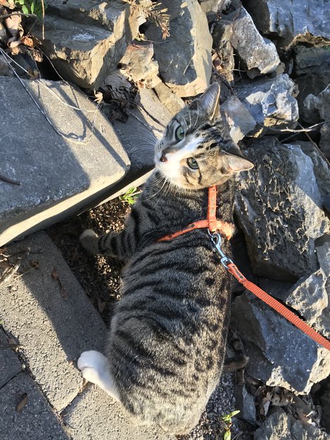 Katten skulle få sin første luftetur i bånd. Den gjorde plutselig et kjempebyks opp mot en murkant med resultat mistet bånd og katten forsvant.
