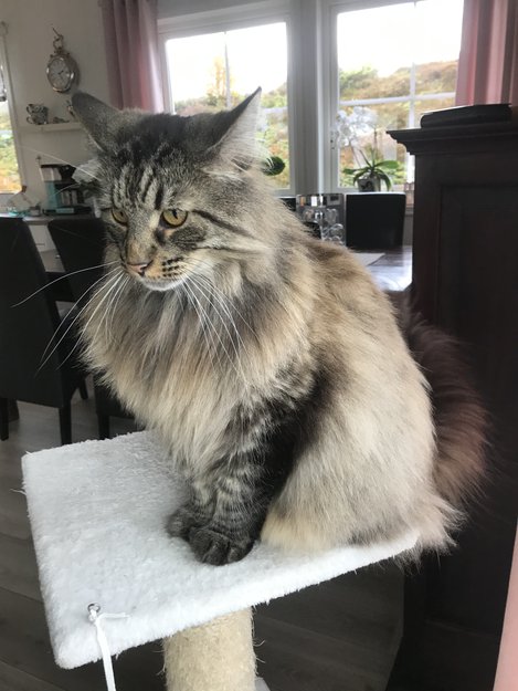 Er en langhåret tricolour og har veldig lang bustete hale. Rødt halsbånd med bjelle og beholder med lapp med tlf. nr.