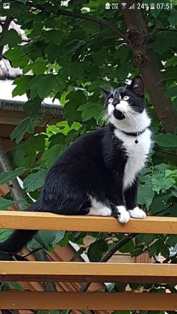 Sort med hvitt bryst og hvite poter. Har en sort flekk på haka og to hvite striper mellom øynene. Bruker halsbånd med bjelle (står også navn og mitt tlf inni).