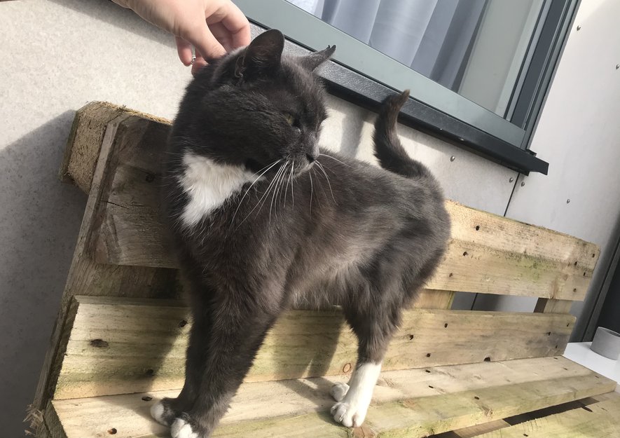 Mørkegrå, med hvit «krage», litt hvitt på frempotene, og lange hvite «sokker» på bakben. Har også et hvitt område på magen. Det ene øret er litt hakkete grunnet mest sannsynlig slosskamp. Har litt mindre pels noen plasser på kroppen. Er veldig tam og kosete.