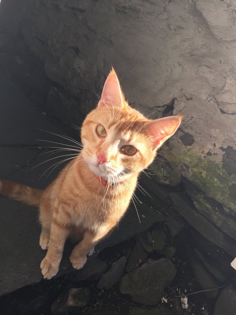Rødstripet. En knekt fortann. Litt hvitt på haletuppen. Kastrert. Chip