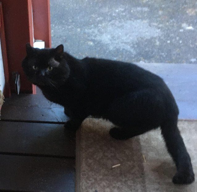 En sort katt har streifet i lengre tid og delvis slått seg ned sammen med våre katter. Ser ut som at han har eller har hatt et sår i hode. Veldig redd.