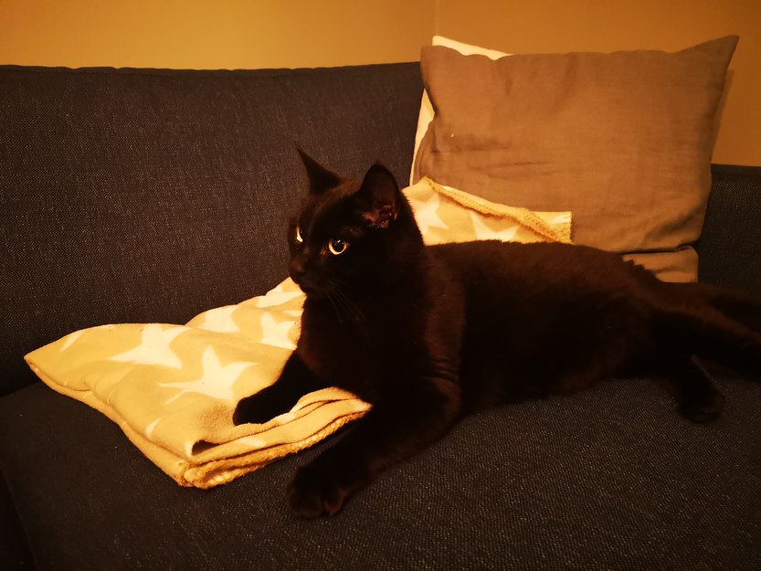 Helt sort utenom inni ørene. Han har kort snute og lager ofte små gryntelydee når han puster. Veldig pratsom og kosete, men litt skeptisk til å begynne med. Bestikkes gjerne med Dreamies.