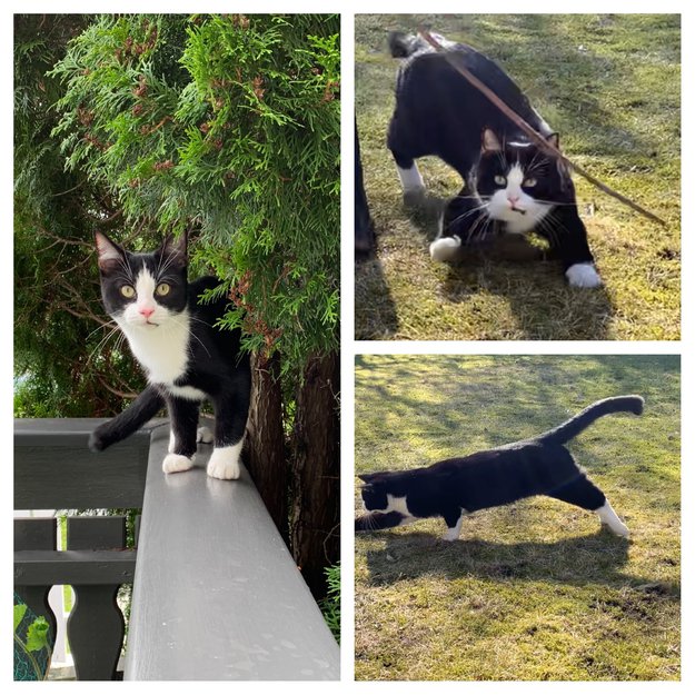 Milo er 1 år gammel, svart og hvit, med svart flekk på munden og han har en knekk på slutten av halen. Han er chippet og kastrerte. Han går på tur med hunder fra nabolaget og kunne ha havnet litt langt hjemmefra.
