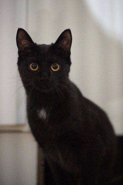 Katten vår er svart, med unntak av ein liten, kvit flekk på brystkassa. Er blitt litt større sidan vi tok dette biletet av henne. Ho blir 1 år i august 2021.