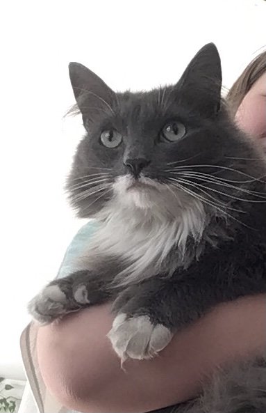 Skipskatt med 7 klør på hver pote. Grå med hvitt bryst og hake samt hvite poter.
