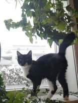 Wasabi er en typisk huskatt med sort pels over og hvit under mage og bryst. (Hvite sokker).