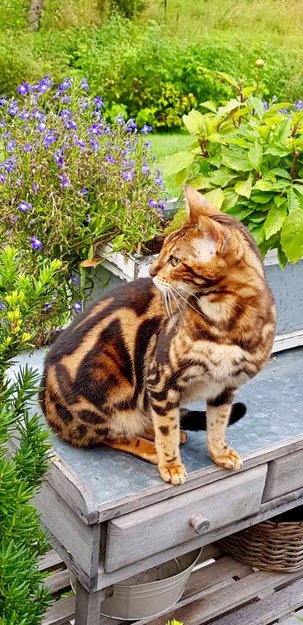 Se bildet. Sorflekkete bengal. Oransje, brun og sort.