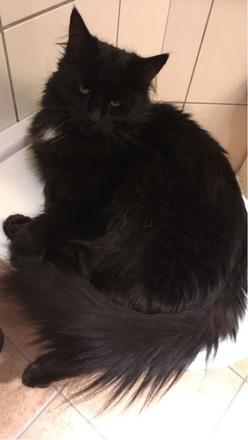 Omtrent stemmeløs katt, klarer en sjelden gang å få ut lyd når han mjauer. Sort blank pels. Bitteliten hvit flekk på brystet. Lang fluffy hale. Stor katt på 5 kg, muligens tynn nå etter å ha vært borte så lenge. Veldig uredd og sosial. Ingen dilter, men liker godt å få kos av hvem som helst. Ikke redd for å gå inn i biler. 8 år gammel og pelsen viser tegn til aldring (har fått hvite hårstrå her og der).