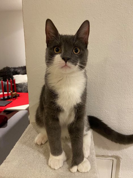 Ludvik er ca. 11 måneder gammel. Grå og hvit skipskatt. Usymmetrisk kjennetegn i ansiktet. Øynene er runde og lysebrune.