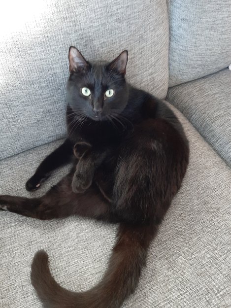 Svært blank i pelsen. Lang hale og lang kropp. Dennis har et kutt i tungen, og er øre merket.