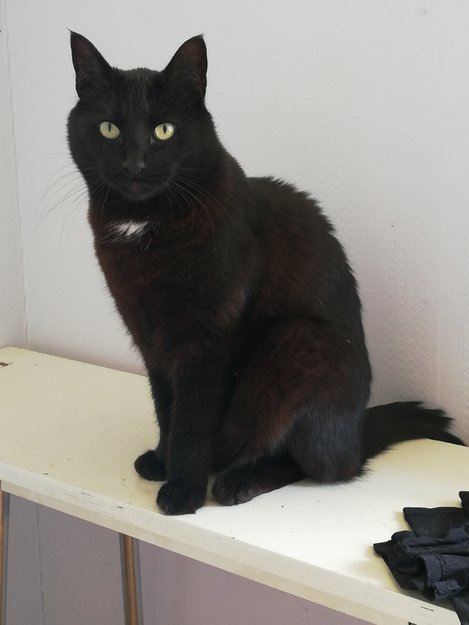 Helt ensfarget, sort hannkatt. Har en liten hvitt flekk på brystet. Gule øyne. Veldig vennlig, om enn litt skeptisk til fremmende og mye lyder. Har slitt litt med flass i pelsen. Vet ikke alder men vi regner med han er passert 10 år.